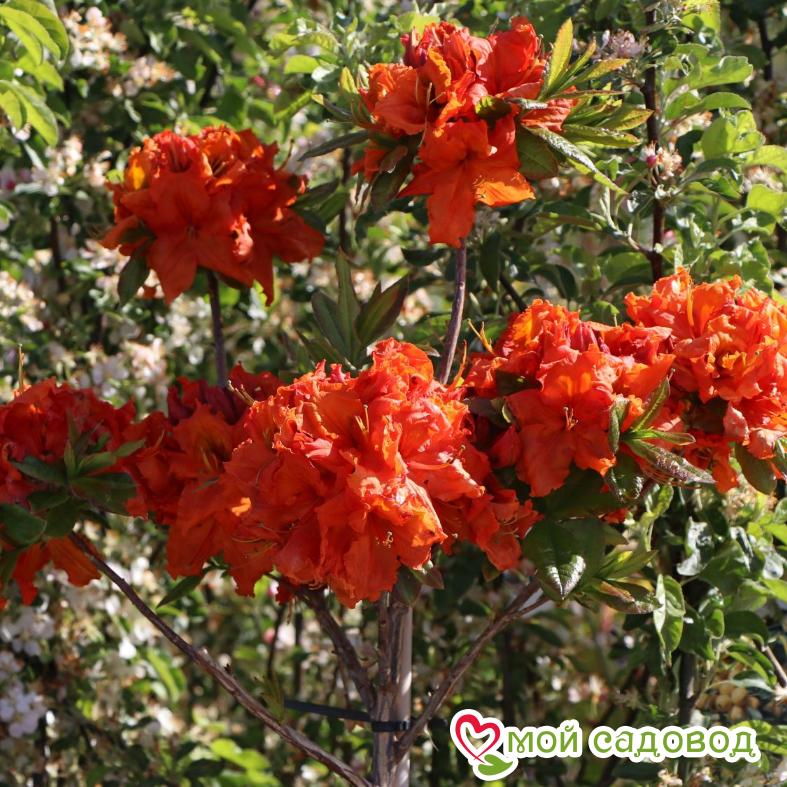 Роскошно цветущий сорт с яркими красно-оранжевыми широко открытыми, воронкообразными цветками. Лепестки с гофрированной кромкой. Верхний лепесток украшен почти полностью оранжево-жёлтым пятнистым рисунком. В соцветии до 10 слегка ароматных цветков. Каждый цветок диаметром 5 см. Цветение в конце мая – начале июня. Куст пряморослый округлый, к 10-ти годам высота 90 см и ширина 70 см, конечная высота 120-150 см и ширина 120 см. Лиственный покров зелёный. При посадке в открытый грунт выбирайте для рододендрона безветренные участки, находящиеся в полутени. Гибрид адаптирован под условия холодных зим и хорошо переносит понижение температур до -30C. Однако из-за особенности корневой системы растение в холодный период нуждается в воздушно-каркасном укрытии. Чтобы цветение было максимально декоративным, вносите комплексные удобрения 2-3 раза за сезон.